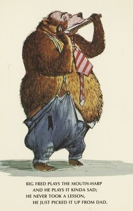 Fred, one of the largest bears, plays the smallest instrument, a harmonica.